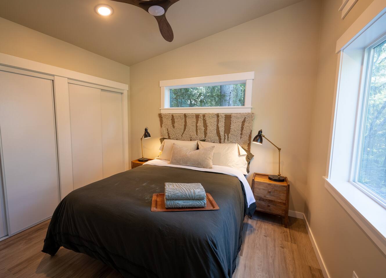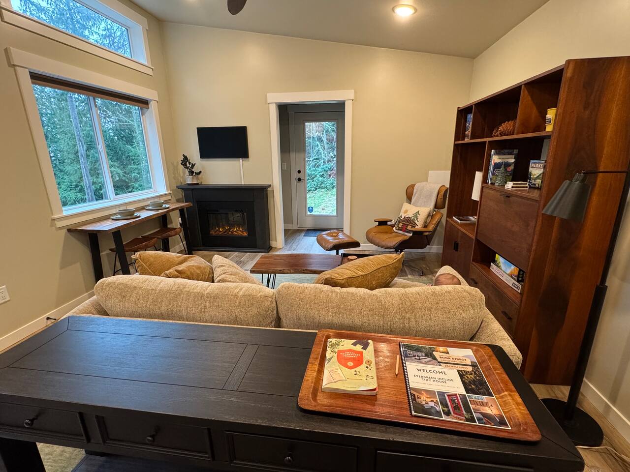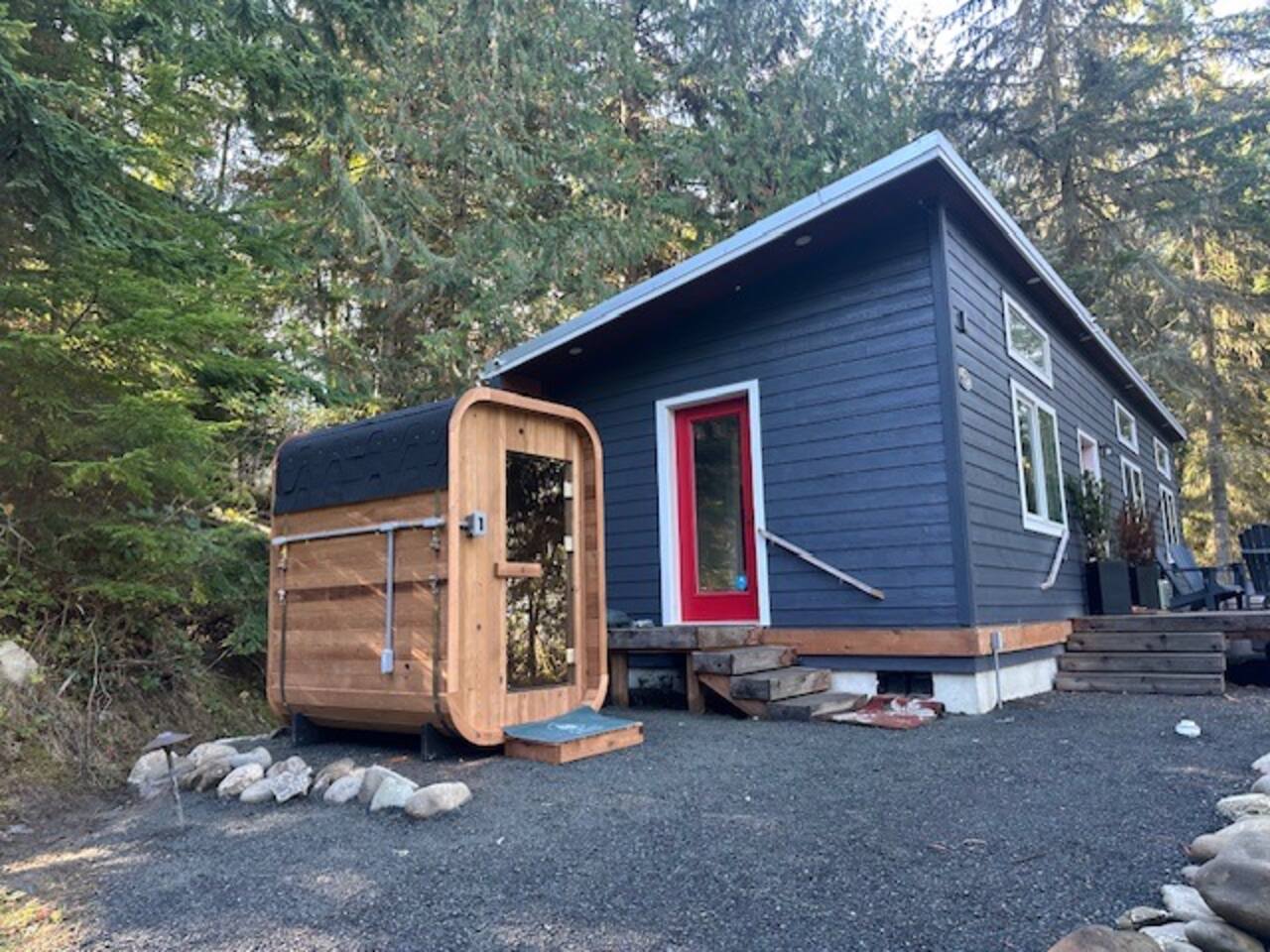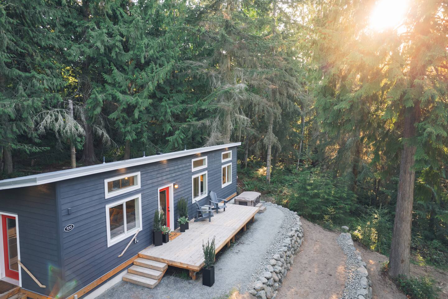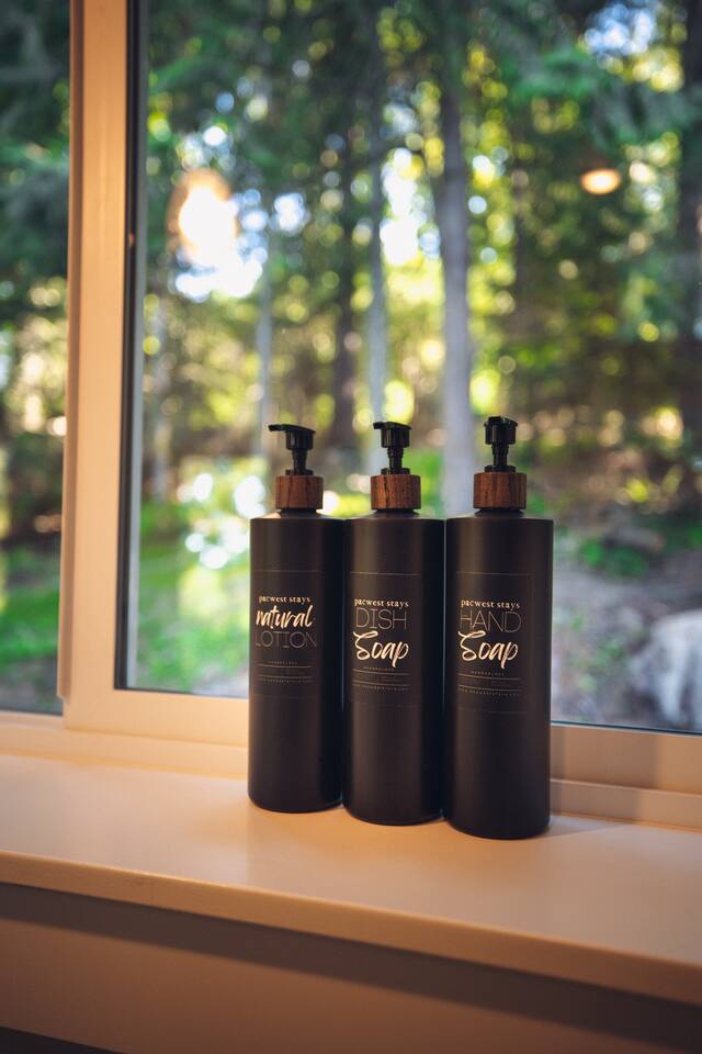 Stay atop the deer park foothills in this brand new tiny house boasting views of the Juan De Fuca straits with completely forested surroundings. With 1 bedroom, 1 bath and a living room that can be transformed into a queen sleeping arrangement, the Evergreen Incline hosts up to four. Enjoy your morning coffee on the front deck or in the 2 person hot tub. Thoughtfully decorated to bring the experience of nature inside, you’ll enjoy natural fiber 100% cotton sheets and cotton linen bedding.
