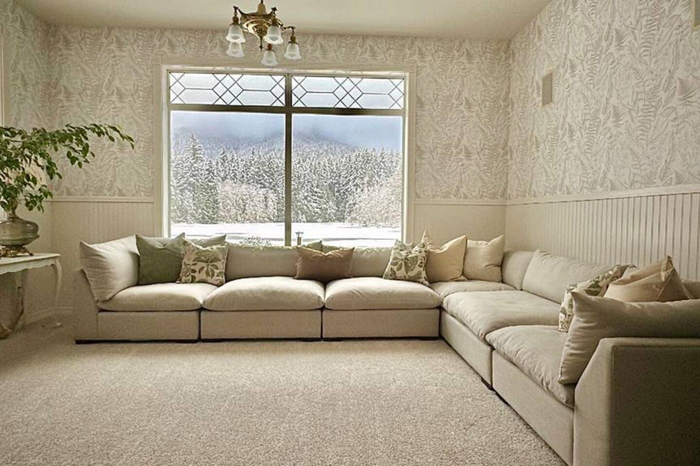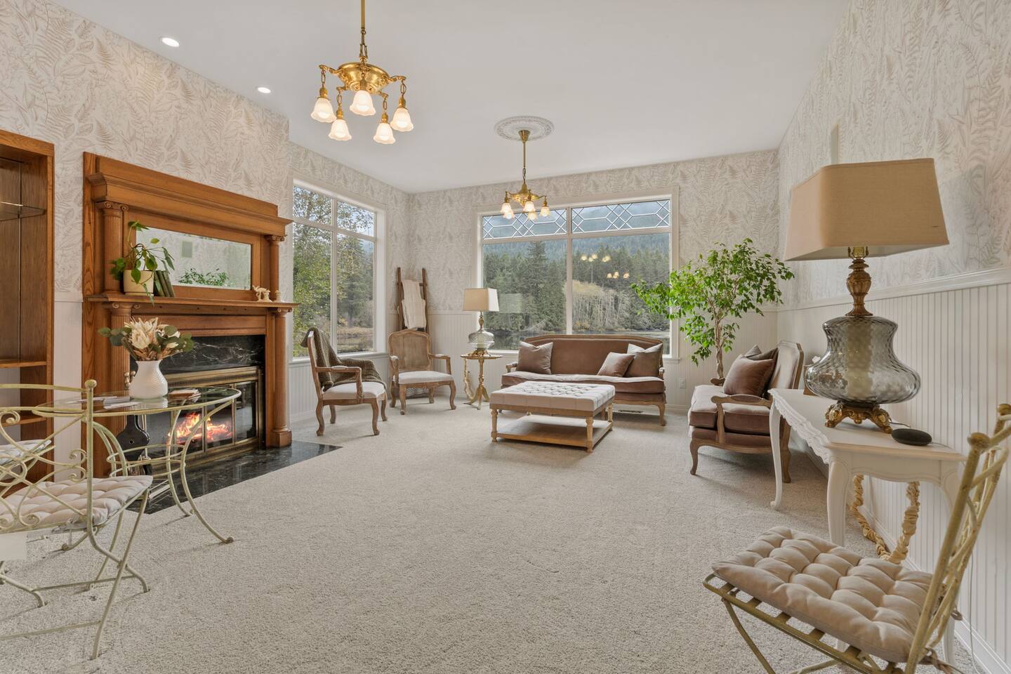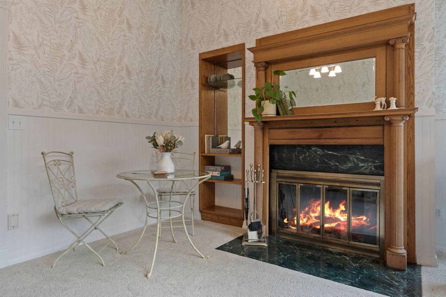 Living Room - The living room features 2 lovely brown velvet couches, newly wallpapered walls, 3 accent chairs and a garden table with seating for 3 to enjoy puzzles or coffee nearby the fireplace.