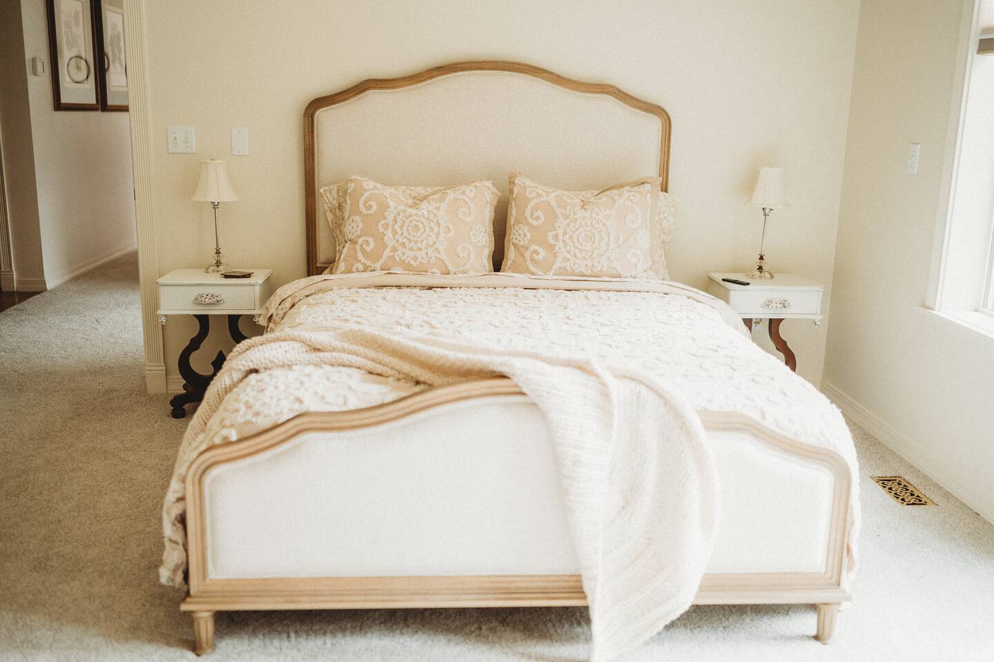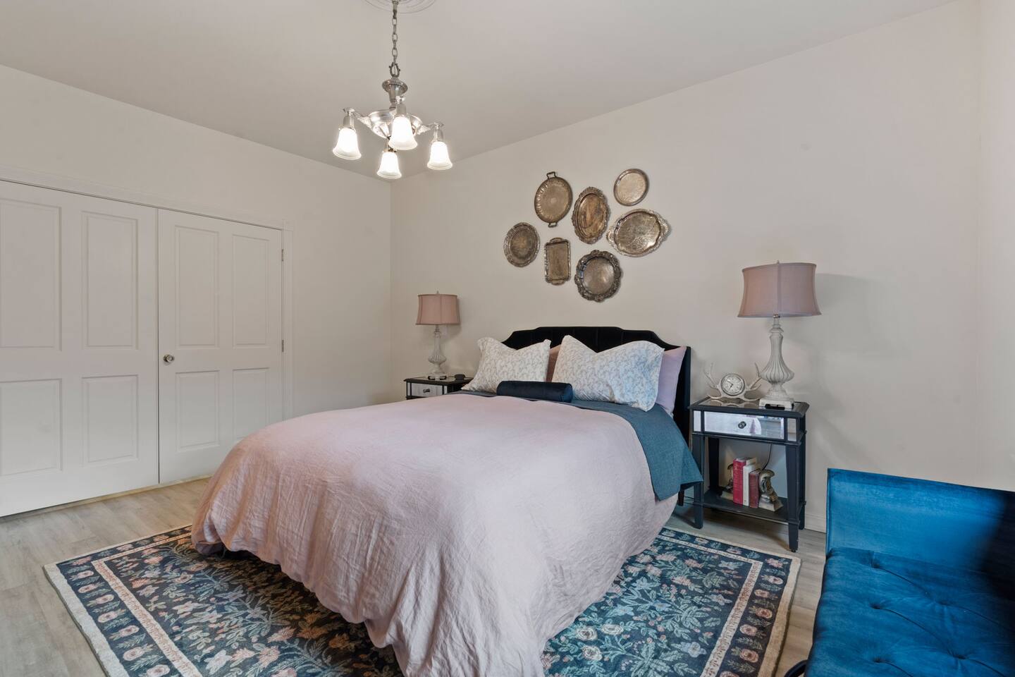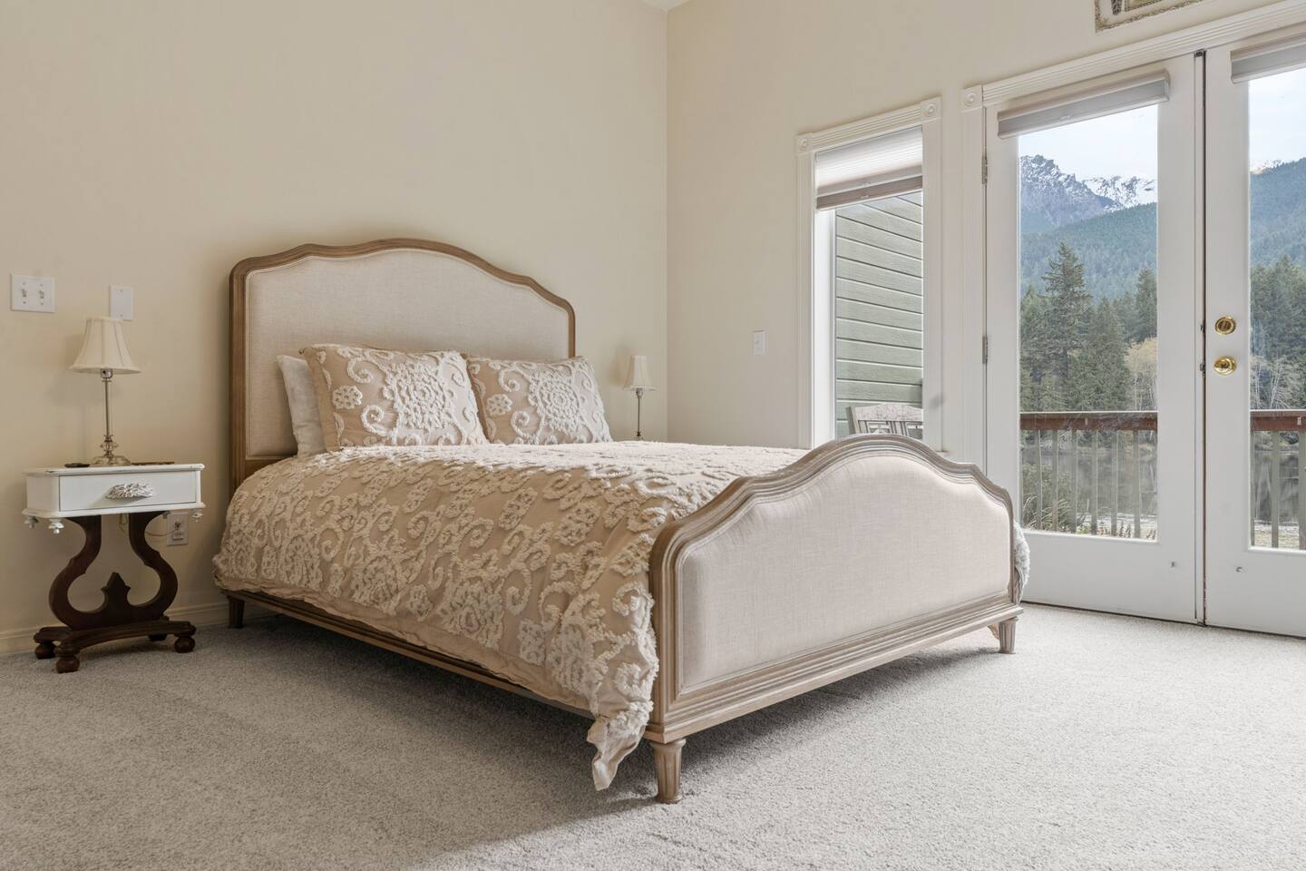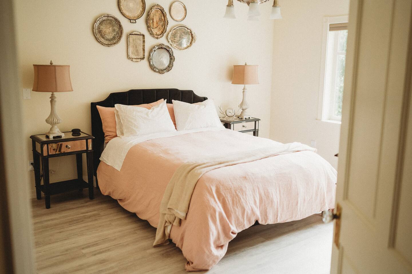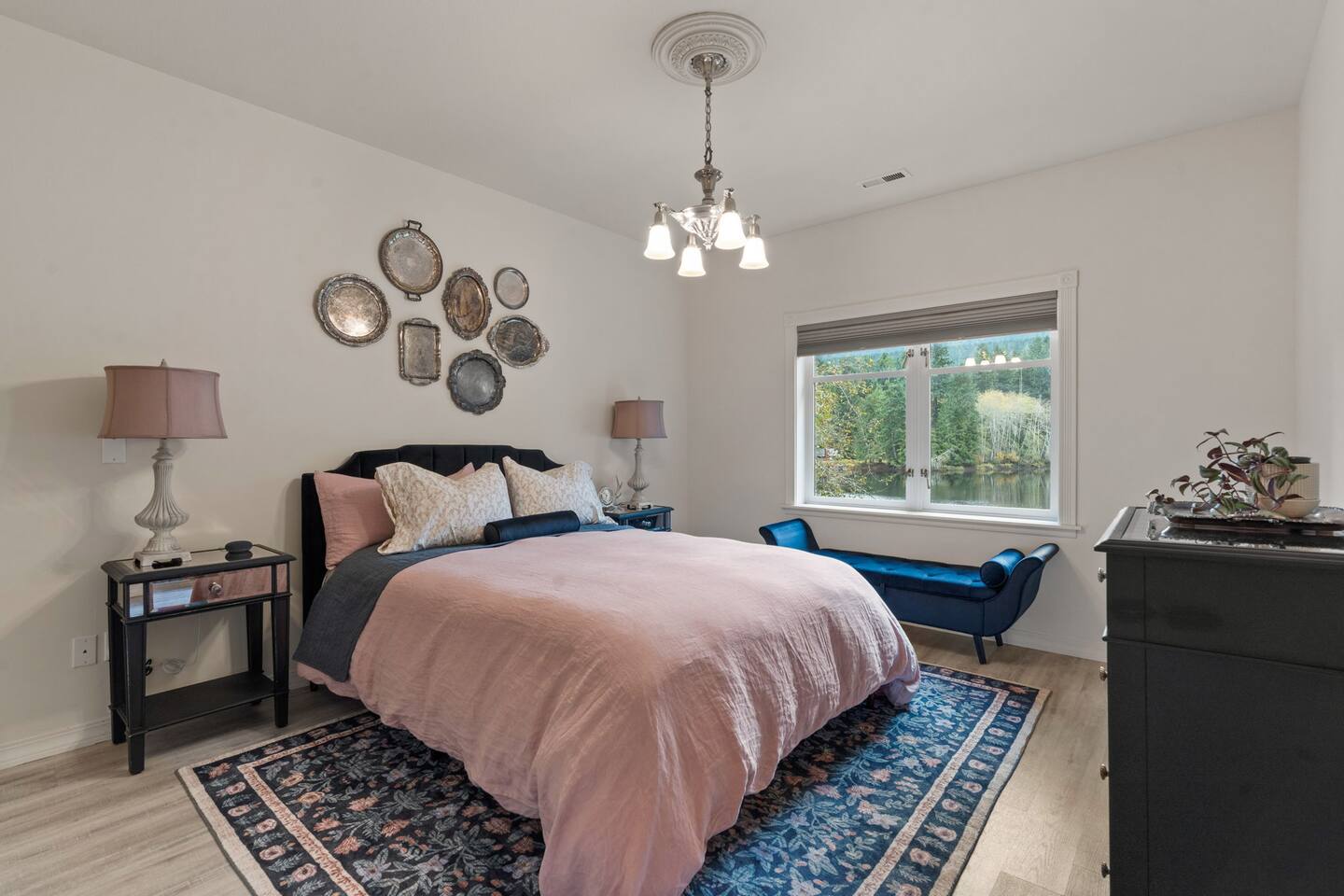 Platinum Room Upstairs - Queen Velvet bed, with Helix mattress, 100% cotton sheets, Quince duvet stuffed with all season Canadian Down insert, two side tables, table lamps, larger mirrored dresser and oversized closet with two large lake windows dressed with Graber blackout blinds, featuring wood floors and a rug to keep your toes warm in the crisp mornings.