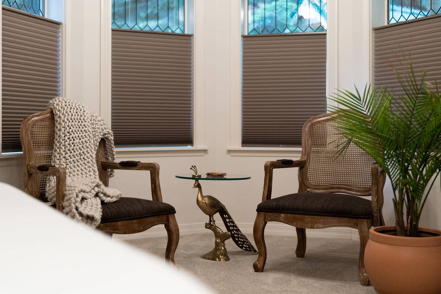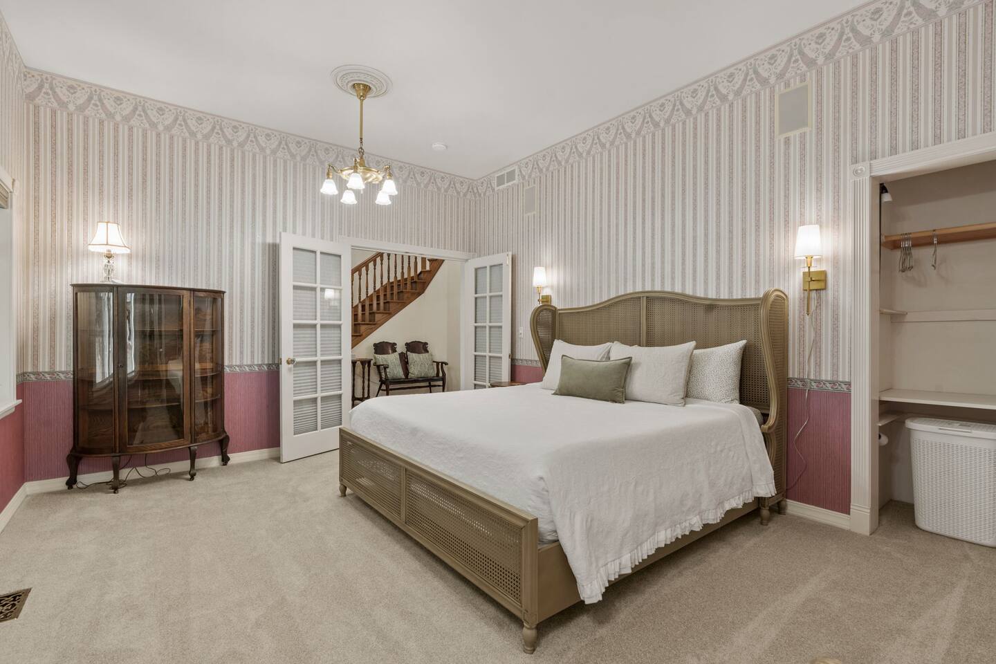 Peacock ADA friendly Room Downstairs - JUST as you enter the house, which does demand going up two porch steps, you'll turn right into the French doors of the peacock room that has no lip or step, making entrance seamless. In this carpeted room, with Graber blackout blinds on each window (including the French doors), you'll find a beautiful Cane Wicker King Size bed made with 100% cotton sheets, a Crate and Barrel Duvet, stuffed with a Canadian Down insert and a comfortable, private seating area, two side tables, sconces with cord switches, a closet and access to a nearby bathroom that has an ADA friendly shower as well.