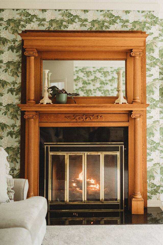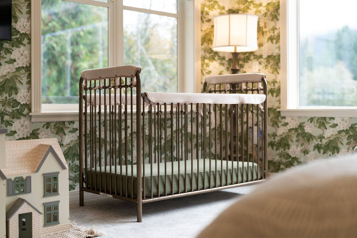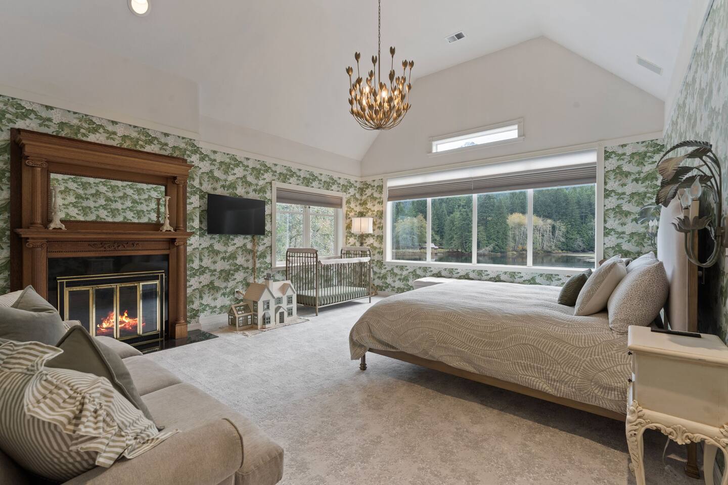 Mother's Master Suite Upstairs - in our Rhododendron papered room, you may not want to join the other guests because your space is so comprehensive and lovely. Complete with a King size bed made up with 100% cotton sheets, West Elm Duvet with an all season Canadian Down insert on a Helix Mattress, crib with crib mattress and organic cotton sheet, 43" Samsung Smart TV, full Graber black out blinds, fireplace, 3 person couch, rocking chair, two side tables, whimsical sconces, a beautiful two person shower, soaking tub with lake view, toilet, sink and vanity with large mirror and amazing light for all your powdering needs. Not to mention the oversized additional closet where we've put a changing table and additional armchair for respite. This room is newly carpeted, features a bench overlooking the largest lake view window, a dollhouse and other wooden toys for your little to enjoy.