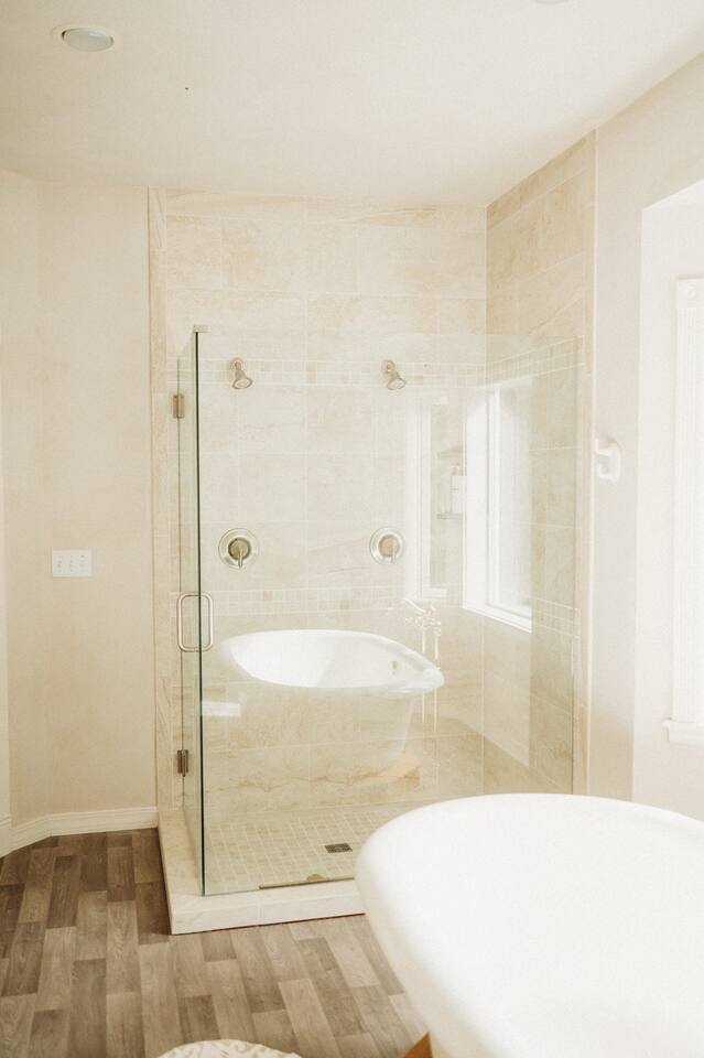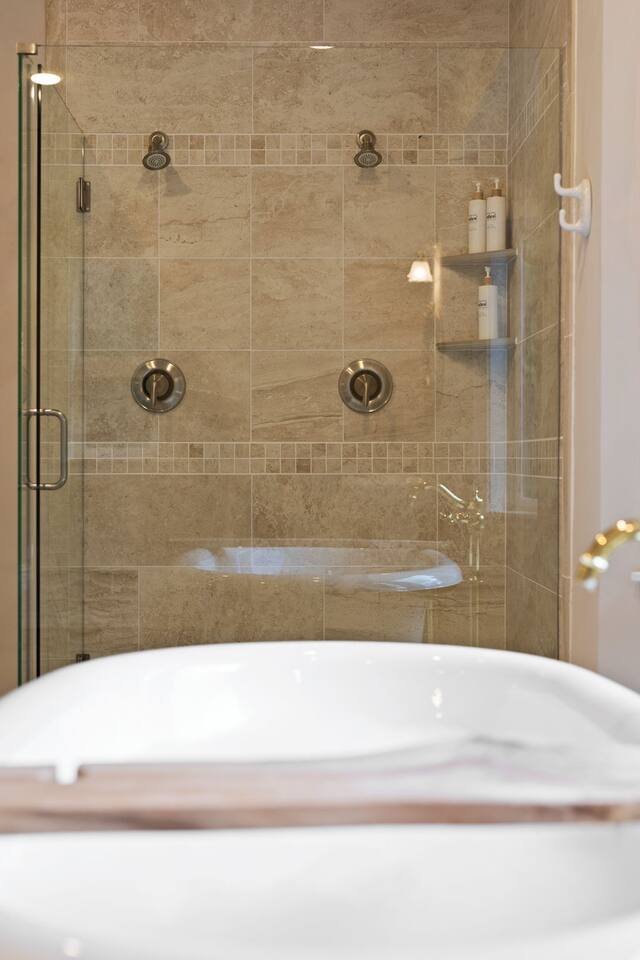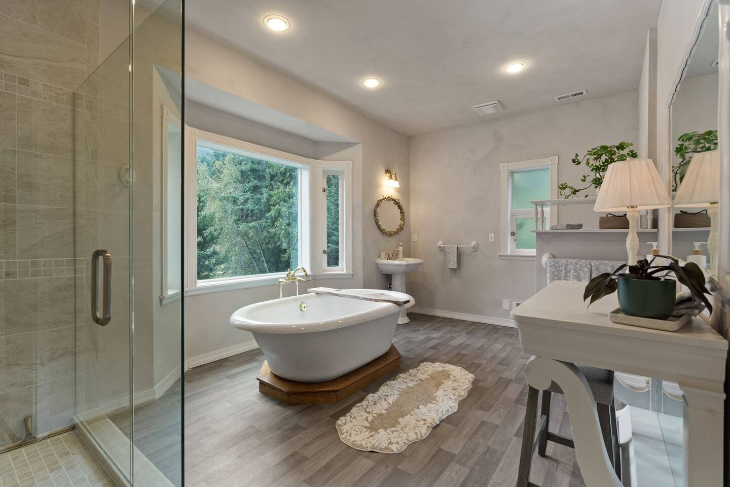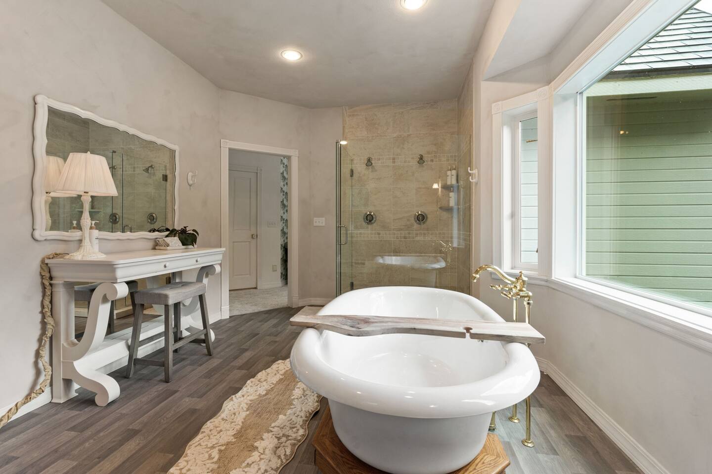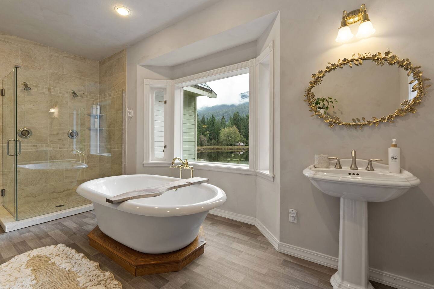 Master Bath - Two person shower, Soaking Tub overlooking the Lake, Large Vanity Counter with Oversized Mirror and Lamp, Toilet. Hair Dryer Provided in each bathroom.