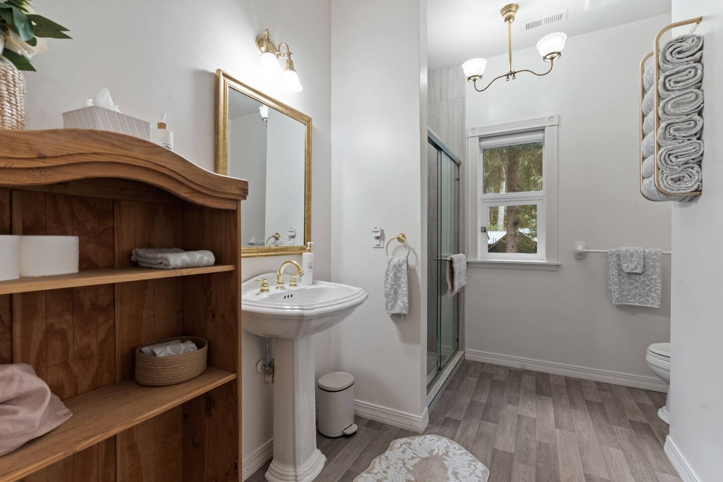 Upstairs Guest Bath - Shower, toilet, Sink, Shelving for hair dryer (provided), towels and tissue box.